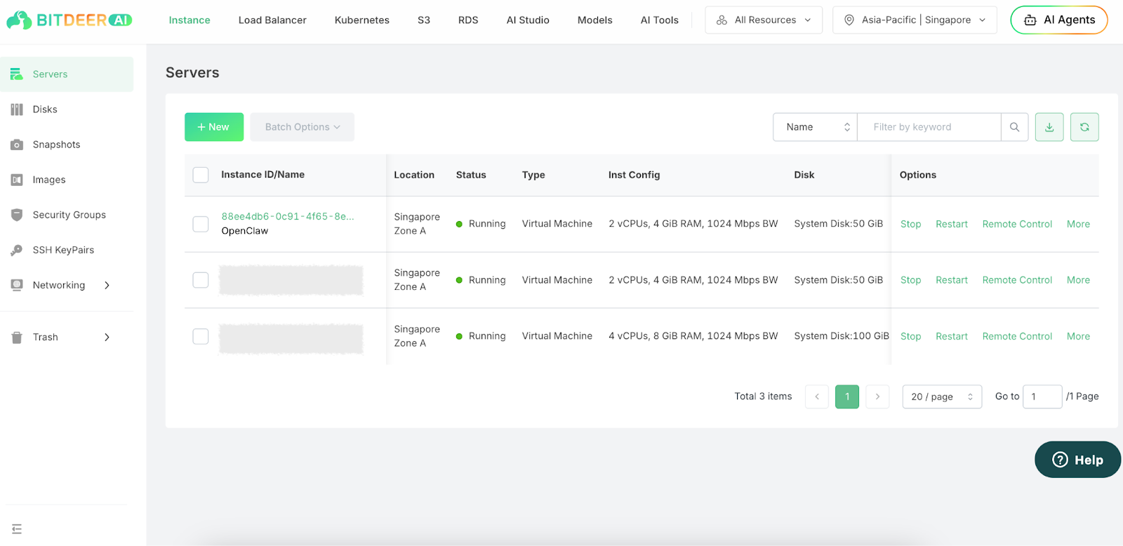 OpenClaw is a powerful AI agent framework that enables you to build intelligent assistants with multiple capabilities, including web search, code execution, and integration with various AI models. With Bitdeer AI Cloud, OpenClaw can be deployed online with flexible resource allocation and usage-based pricing, making it easier to run AI agents without long-term hardware constraints.
