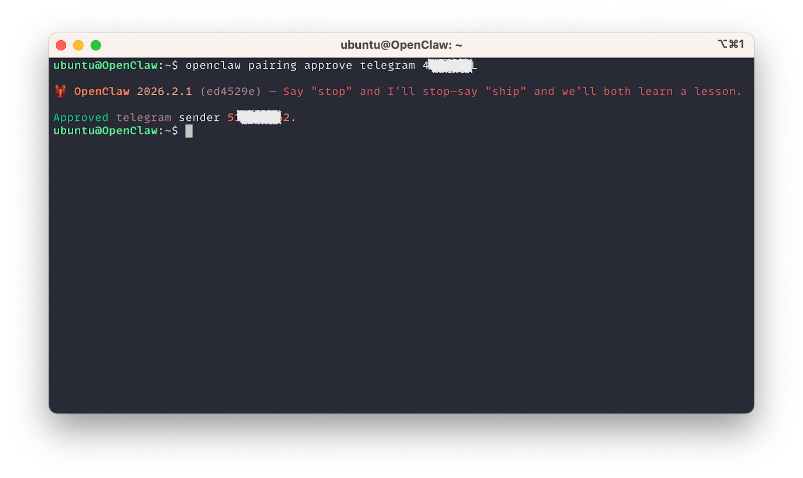 After the OpenClaw service is running with Telegram integration enabled, you need to pair your Telegram chat: