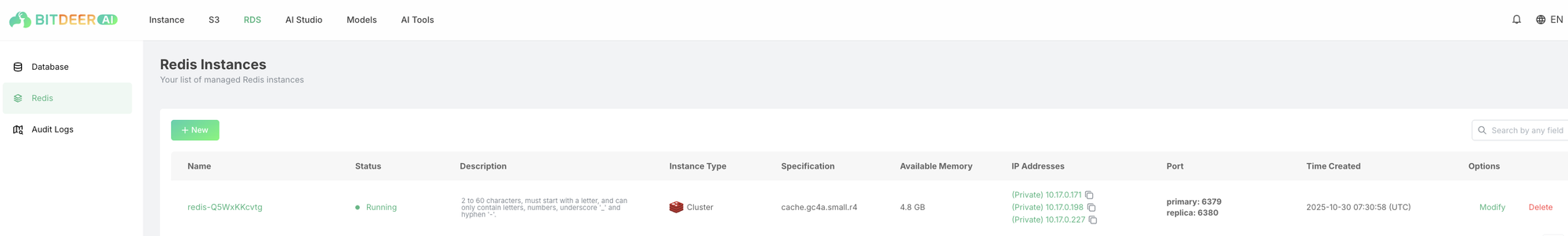 Redis is a fully managed in-memory data structure store service that provides high-performance caching and data storage capabilities. Our Redis service makes it easy to deploy, operate, and scale Redis deployments in the cloud, handling complex infrastructure tasks so you can focus on building fast, responsive applications.